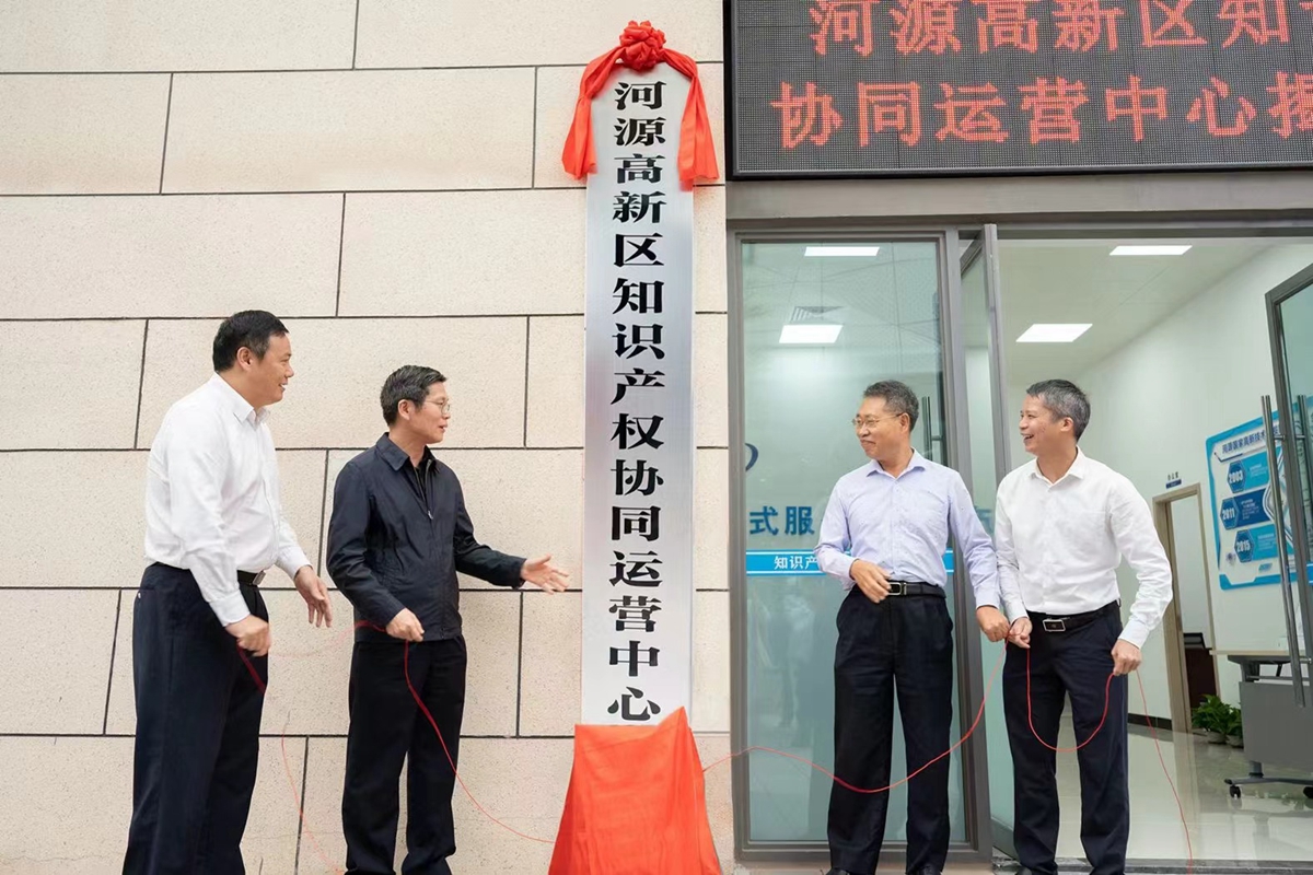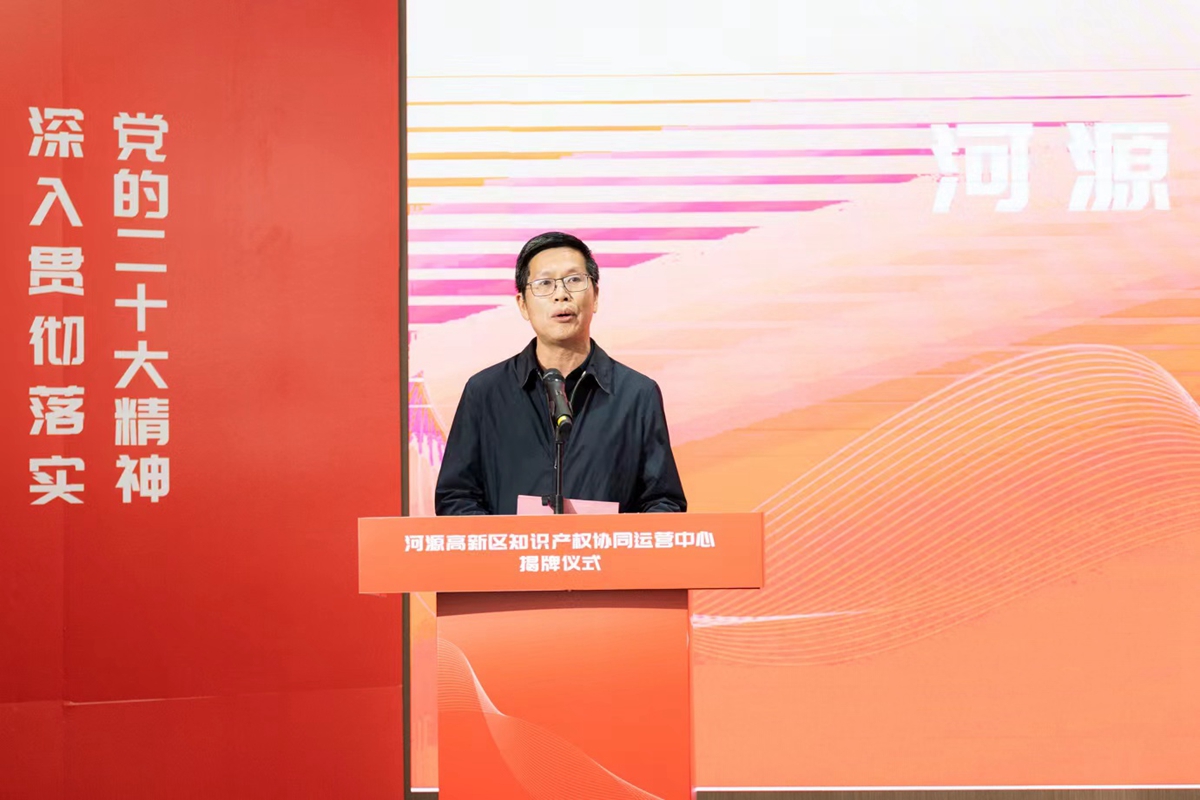为助推知识产权强国建设,推进河源高新区创新主体知识产权高质量发展,11月23日,河源高新区知识产权协同运营中心在河源市高新区深河金地创谷举行揭牌仪式,学校副校长苏晖,河源市府办二级调研员王少锋到会致辞,仪式由河源市市场监管局党组书记、局长徐学章主持。河源国家高新区管委会主任陈志中以及河源校区管委会、河源研究院、市灯塔盆地农高区管委会、县区市场监管局、高新区等相关部门负责人,知识产权运营相关服务机构、企事业单位代表50余人参加本次活动。