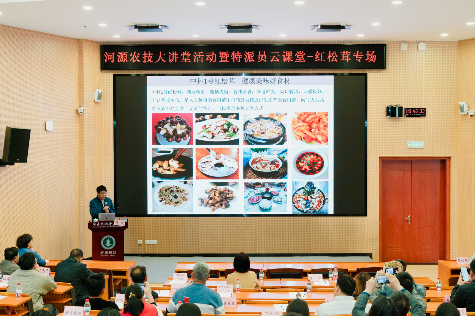 为贯彻落实乡村振兴战略,有效盘活冬闲田资源,推广生态循环农业模式,2026年1月8日,“河源农技大讲堂暨特派员云课堂”红松茸专场活动在广东技术师范大学河源校区博学大讲堂105室顺利举行。活动由河源市科学技术局指导,河源市广师大研究院、河源市市级农村科技特派员工作站主办,河源市农业产业化龙头企业协会、源南镇人民政府、河源市县级农村科技特派员工作站(龙川)协办。活动吸引了河源市各大龙头农业企业代表、源南镇各镇村代表及广东技术师范大学师生约80人现场参会,同时通过“特派员云课堂”同步线上直播,惠及更多有种植需求的观众。